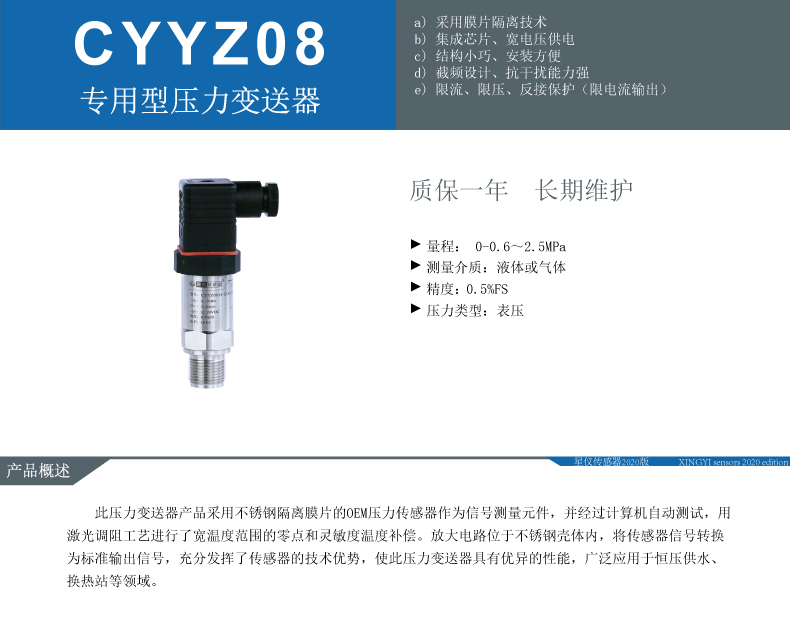 此壓力變送器產(chǎn)品采用不銹鋼隔離膜片的OEM壓力傳感器作為信號(hào)測(cè)量元件,并經(jīng)過(guò)計(jì)算機(jī)自動(dòng)測(cè)試,激光調(diào)阻工藝進(jìn)行了溫度范圍的零點(diǎn)和靈敏度溫度補(bǔ)償。放大電路位于不銹鋼殼體內(nèi),將傳感器信號(hào)轉(zhuǎn)換為標(biāo)準(zhǔn)輸出信號(hào),充分發(fā)揮了傳感器的技術(shù)優(yōu)勢(shì),使此壓力變送器具有優(yōu)異的性能,廣泛應(yīng)用于恒壓供水換熱站等領(lǐng)域。