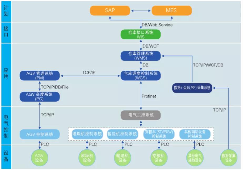 項目系統架構。物流自動化系統由多個軟件系統組成,各個軟件系統通過接口系統進行信息交互,一起構成一個完整的倉儲物流自動化系統,實現倉儲設備的管理、調度控制以及倉儲數據的管理。物流自動化系統包括倉儲管理系統(WMS)、倉儲調度控制系統(WCS)、AGV管理系統(PM)和電氣控制系統,電氣控制系統包括堆垛機控制系統、輸送機控制系統、穿梭車(STV/RGV)控制系統、AGV控制系統和輔助電氣設備控制系統,通過不同的技術和協議實現倉儲物流信息系統與外部系統(例如ERP、SAP、MES)、各個子系統間的交互,相互配合完成各個流程作業任務。