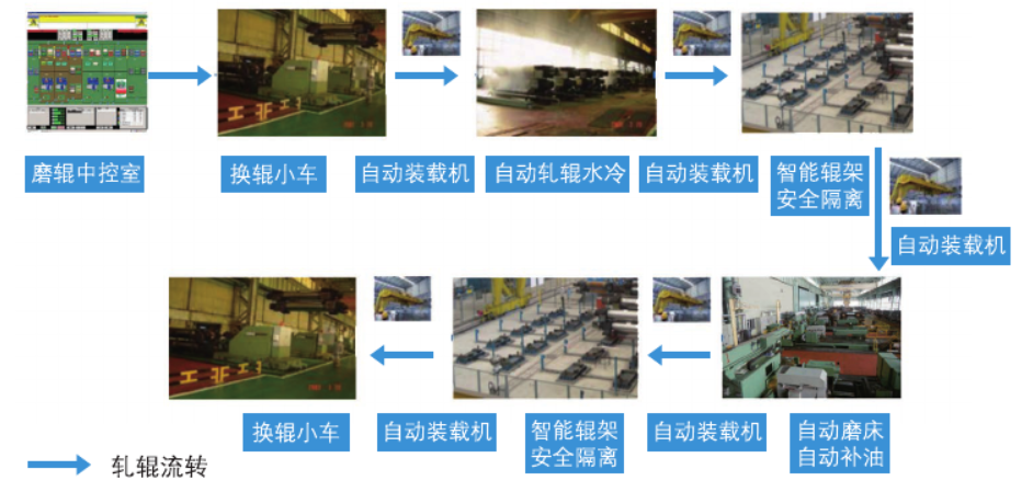 通過磨輥間自動化建設,大大提高了軋線供輥能力,避免了安全風險,降低了生產成本,提高了環保節能水平。 磨輥間自動化工藝流程。根據自動化工藝流程,磨輥間功能區域重新規劃布局,并進行生產工藝的智能化升級,新建磨輥間全區域軋輥自動識別系統、全自動軋輥裝載機系統、半自動化行車系統、自動水冷系統、智能補油機器人系統,實現對軋輥流轉的全程自動控制。下圖為無人化磨輥區域工藝流程圖。