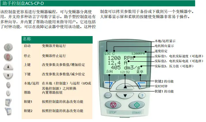 02、中文面板也稱為助手控制盤,型號為ACS-CP-D,我們一般稱之為中文盤,相對來說顯示的內容就豐富多了,且可以中文顯示一目了然。一般使用中文盤的時右上角顯示速度給定的地方會以百分比的形式顯示目標壓力,通過按動變頻器操作面板上的上鍵或者下鍵可以直接調整百分比大小來設定目標壓力。如果不能通過上下鍵調試,為避免誤操作建議來電咨詢,我們將免費電話指導調試。