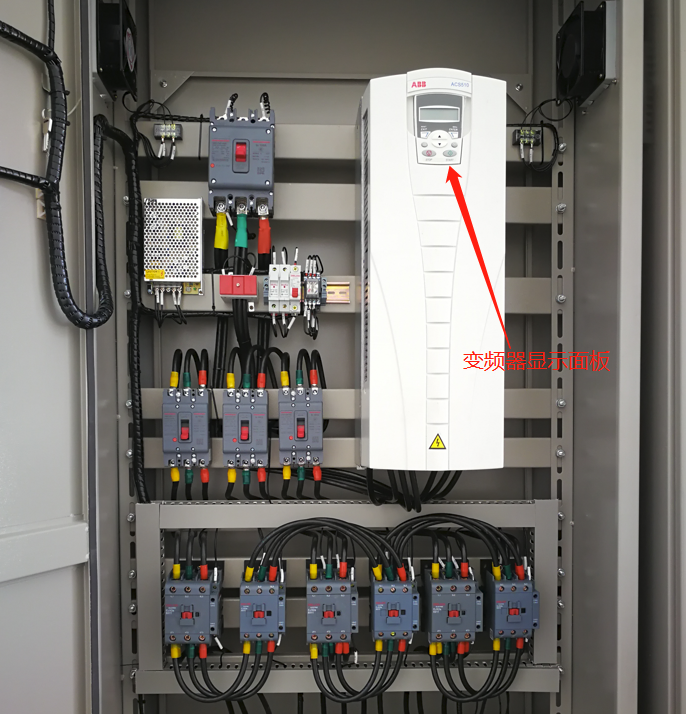 下圖為一個典型的恒壓供水控制柜,紅色箭頭指向為ABB變頻器的操作面板。